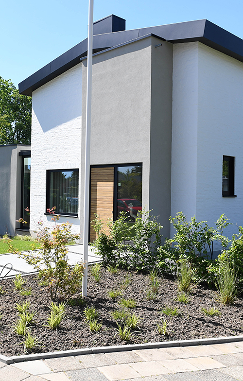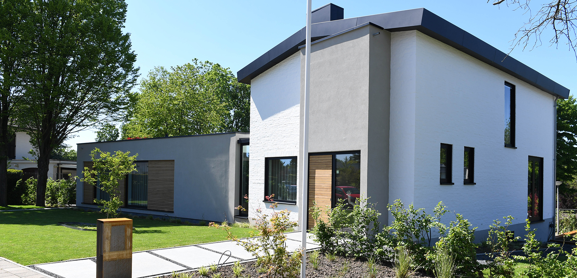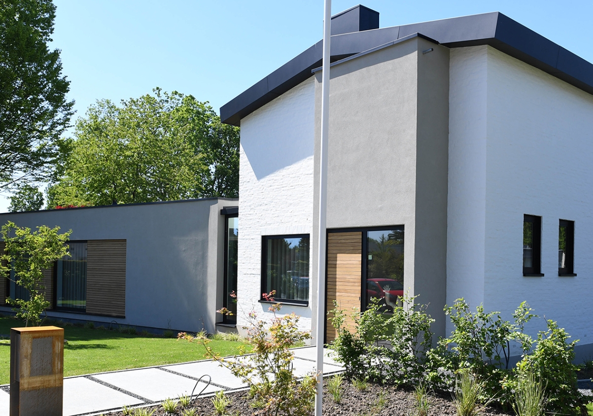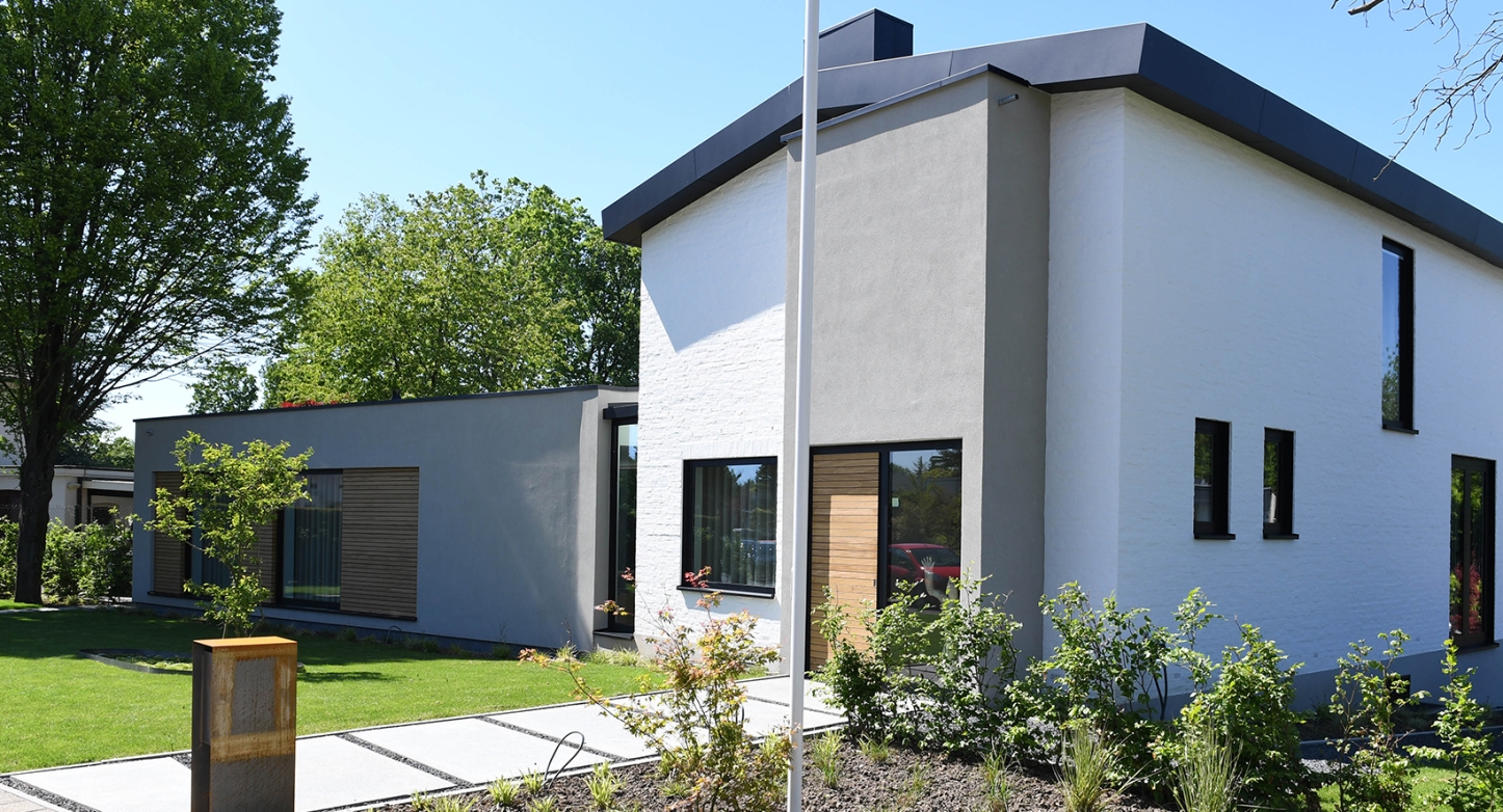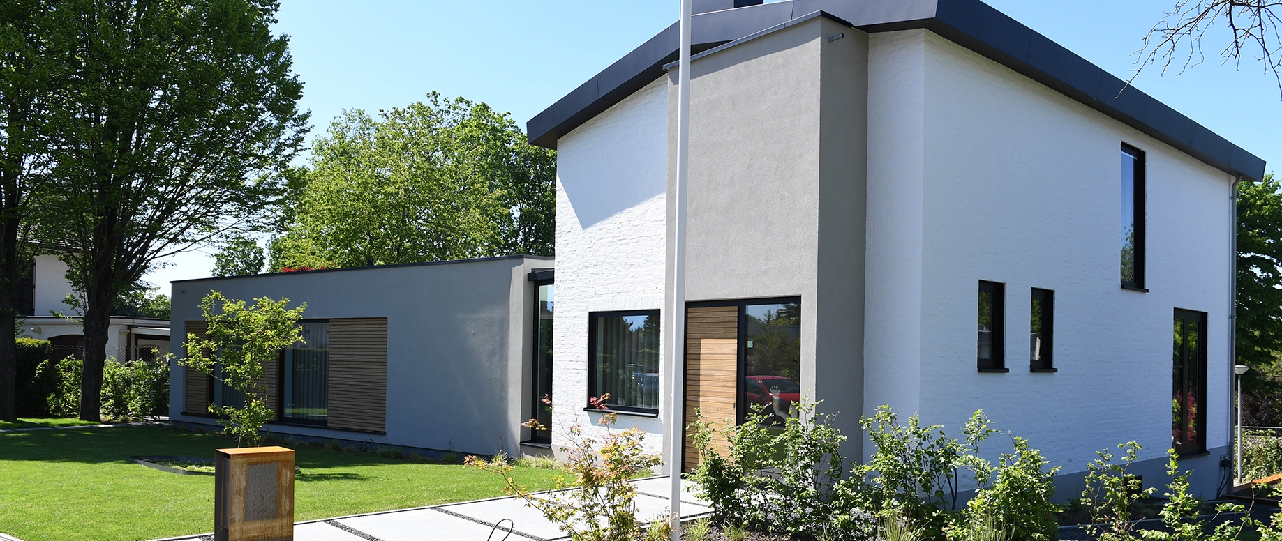 Modern met respect voor het bestaande.. Zo omschreef de architect de verbouwing van deze klassieke jaren 50- woning. Drie strakke, met stucwerk afgewerkte volumes, werden aan het statige woonhuis gekoppeld. Samen vormen zij een evenwichtige compositie van oud en nieuw.