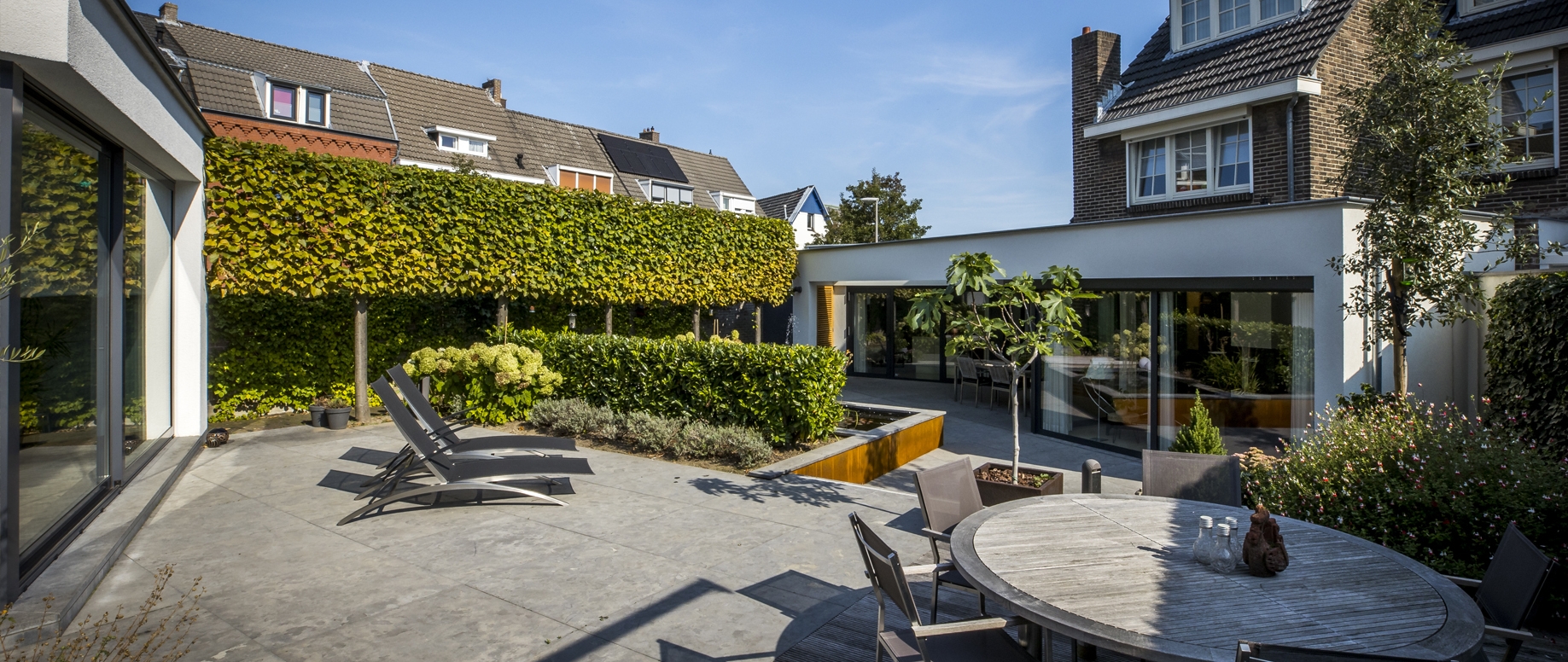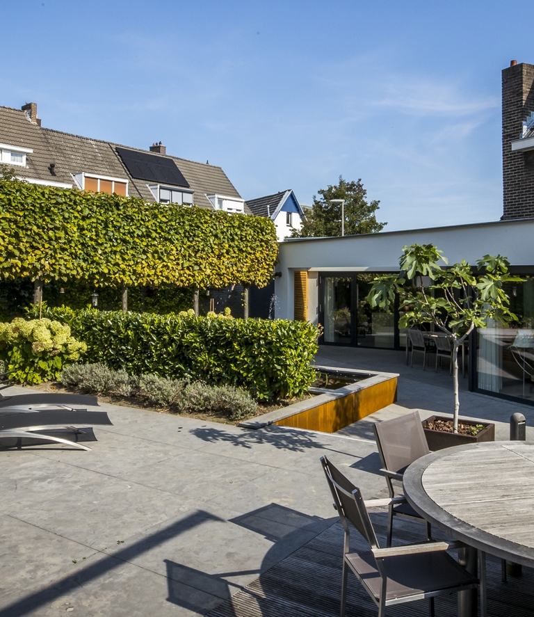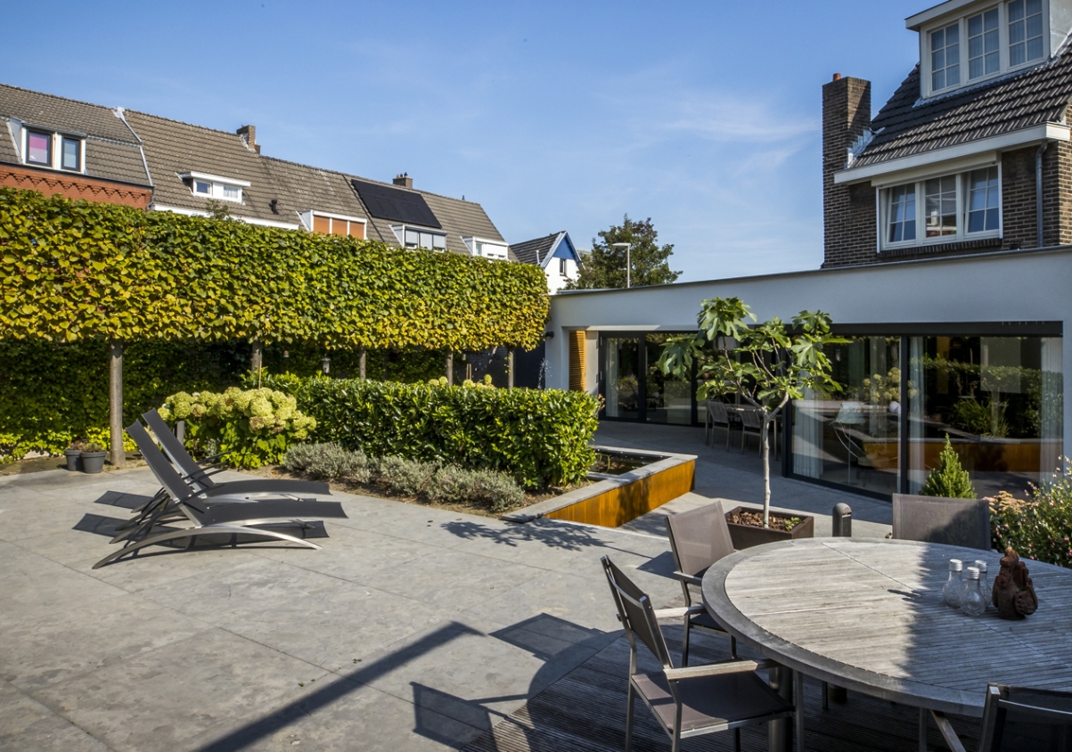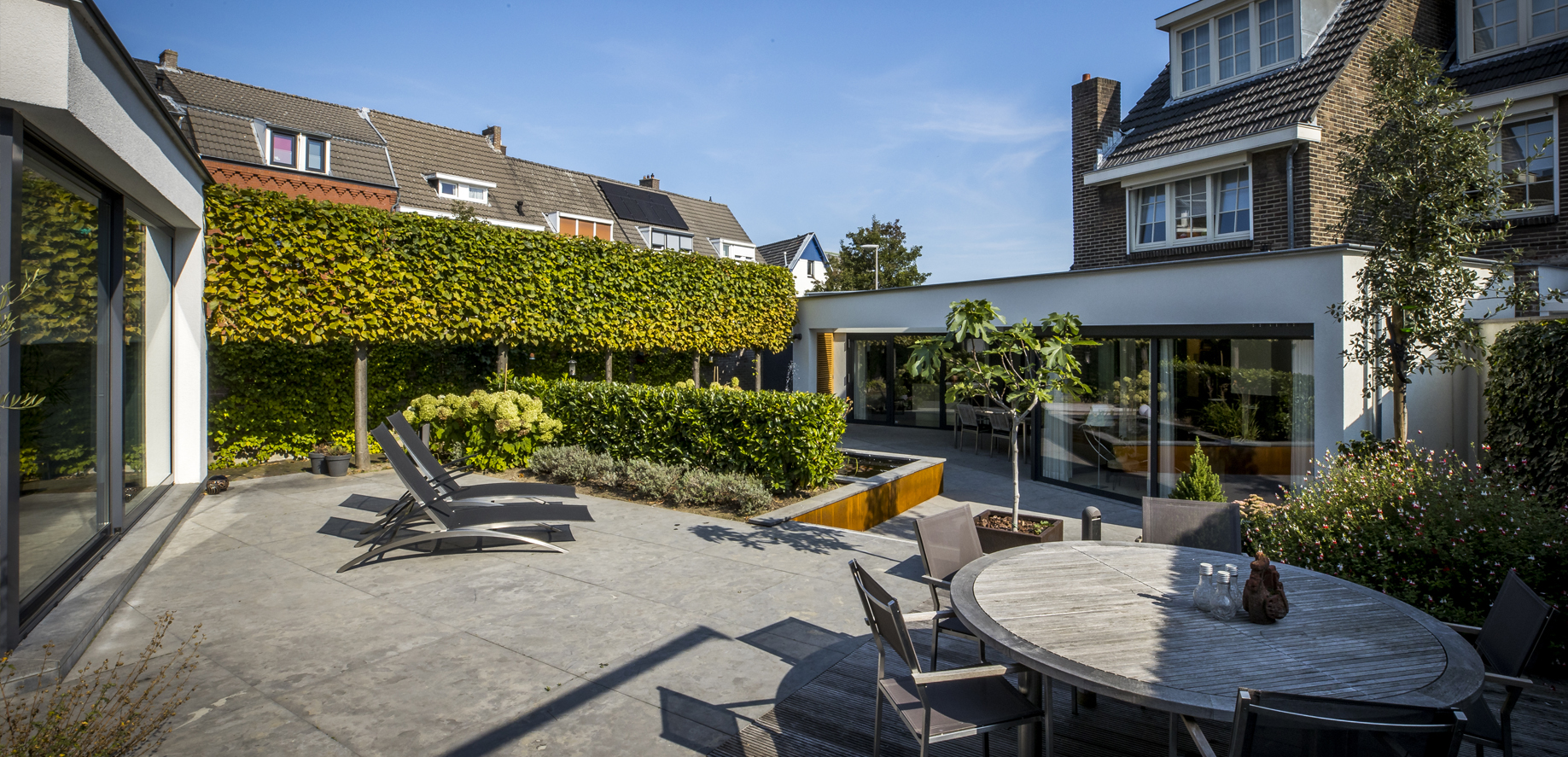 Dat was de opgave in de gefaseerde verbouwing van de 2 panden die worden verbonden door een schitterende patiotuin. De 2 panden zijn verdeeld in de woning (met een terras dat is overdekt met een luifel) en aan de andere kant een wellness ruimte met intiem terras die grenst aan dezelfde patiotuin. Wij hebben deze woningen wederom in verschillende fases verbouwd.