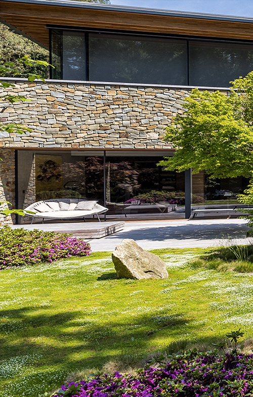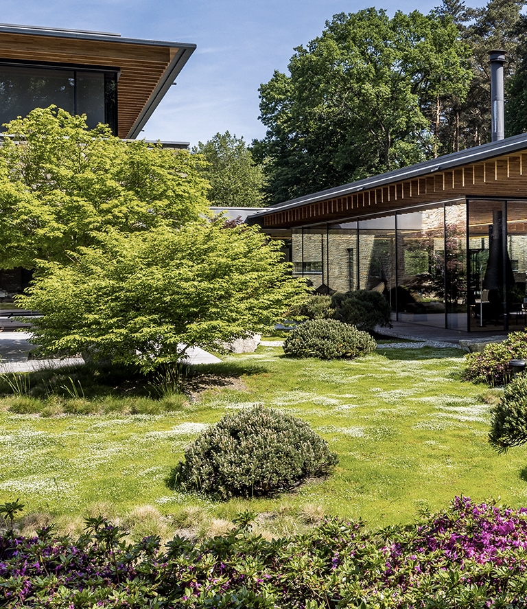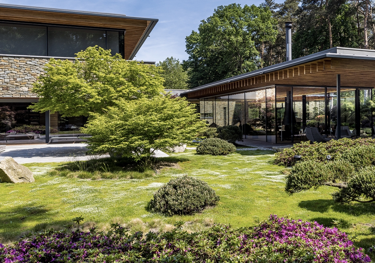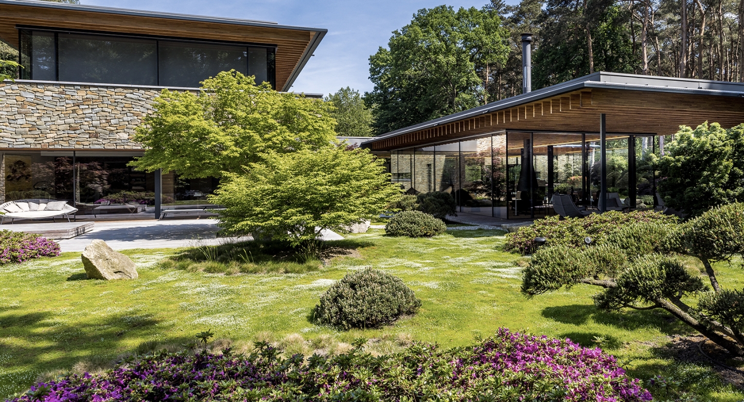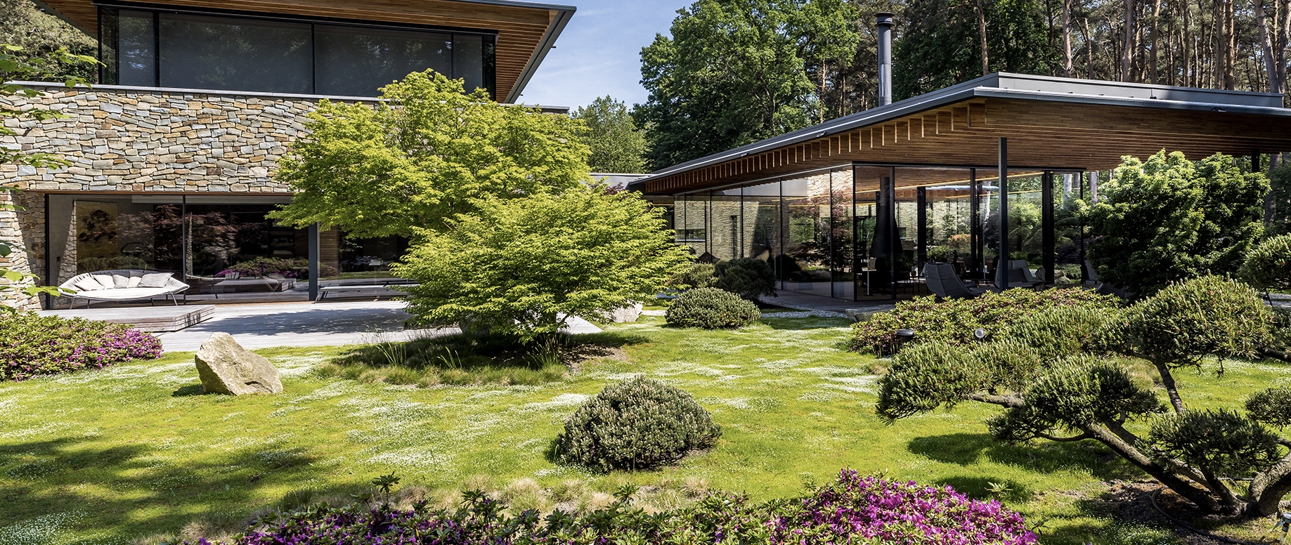 Adembenemende villa in een net zo prachtig landschap. Ontworpen naar Japanse inspiraties die terug te zien zijn in de houten uitkragende slanke gelamineerde liggers, de natuurlijke gevelstenen en grote glazen puien van Sky Frame die nagenoeg ‘kozijn loos’ zijn.